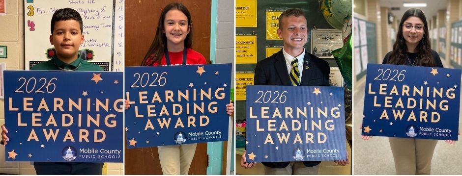 Mobile County Public Schools recognized four top students for the impact they are making at their schools and in the community, surprising them in their classrooms this week with district-wide Learning Leading Awards. They are: Rylan Besaw of Gilliard Elementary School, Anniston Byrd of McDavid-Jones Elementary School, Benjamin Stringfellow of Phillips Preparatory School, and Farah Hujier of Davidson High School.