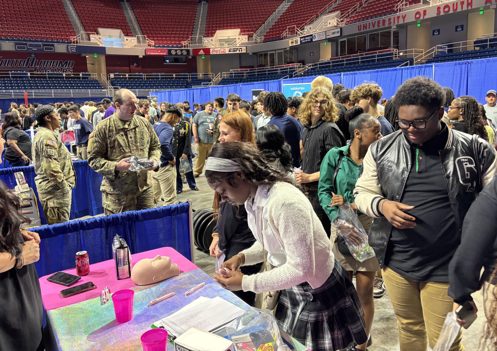 About 3,000 seniors attended the annual High School Career Fair at the USA Mitchell Center. The career fair, presented by the MCPSS Career Technical Education Department in partnership with the Mobile Chamber's Workforce Development team, brought students from all 12 MCPSS high schools in to meet industry partners, along with numerous representatives from colleges and universities. Students prepared for the Career Fair by practicing interviewing skills, polishing their resumes and researching companies.