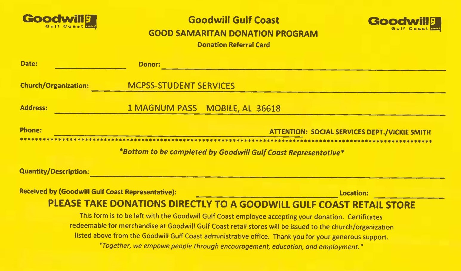 Make your donations count: Mobile County Public Schools is a participant in Goodwill's Good Samaritan Program. Use the yellow Donation Referral Card when you make a donation to any Goodwill Gulf Coast retail store, and Goodwill will give a credit voucher to MCPSS Student Support Services. (Donors will still receive a blue donation receipt for tax purposes.) The yellow donation cards have been distributed to all MCPSS schools; if you need one, please contact Sally Ericson.