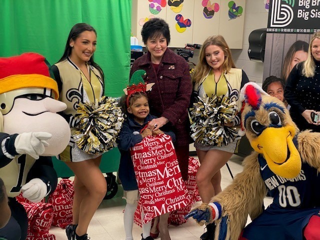 Christmas came early for a group of "littles" at E.R. Dickson Elementary, as New Orleans Saints and Pelicans owner Gayle Benson brought gifts for them through a partnership with Big Brothers Big Sisters of the Central Gulf Coast. Joining her to greet the students were Saints mascot Sir Saint, Pelicans mascot Pierre T. Pelican, and two members of the Saints Cheer Krewe. Big Brothers Big Sisters has mentoring programs at several Mobile County Public Schools. |