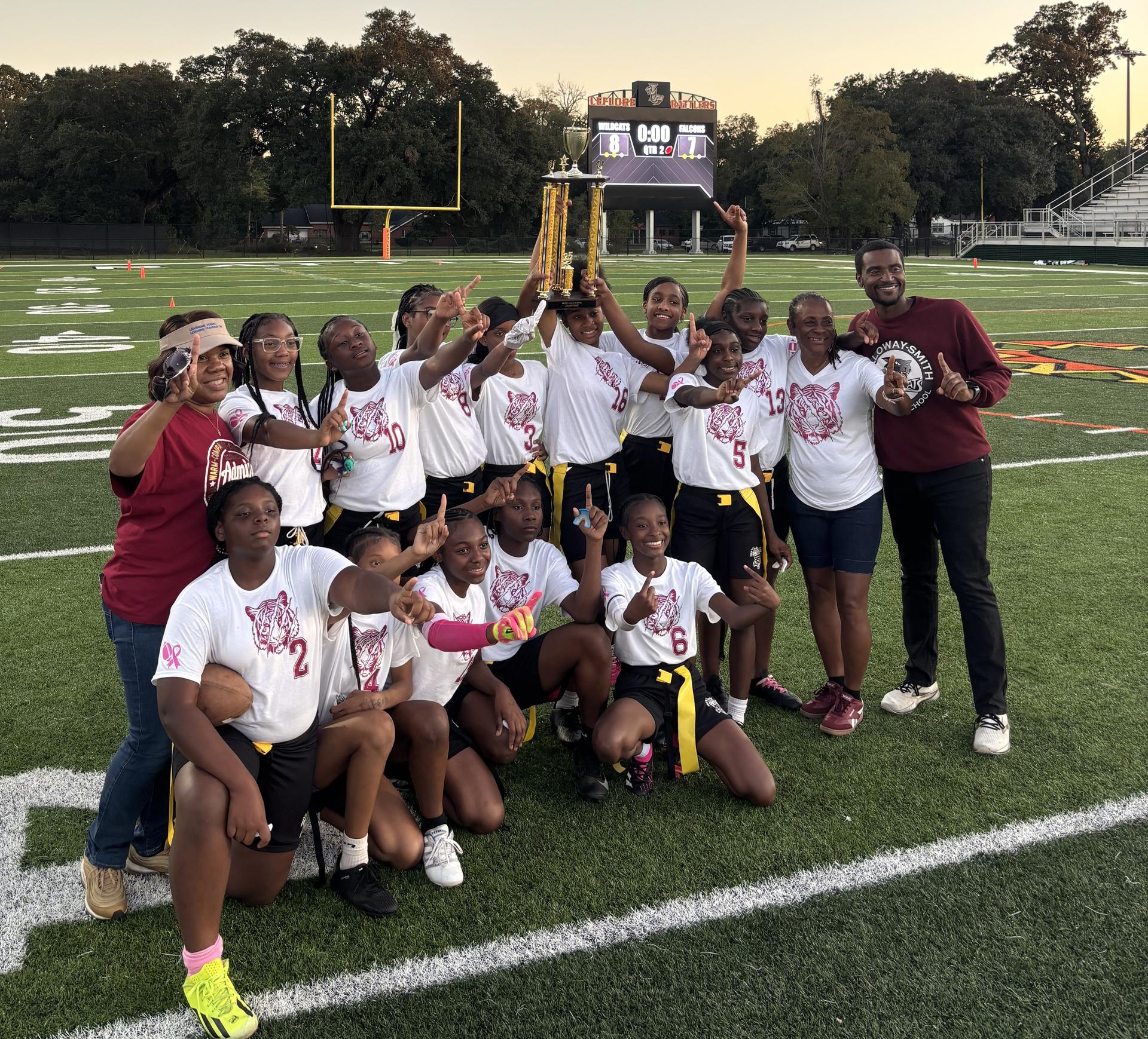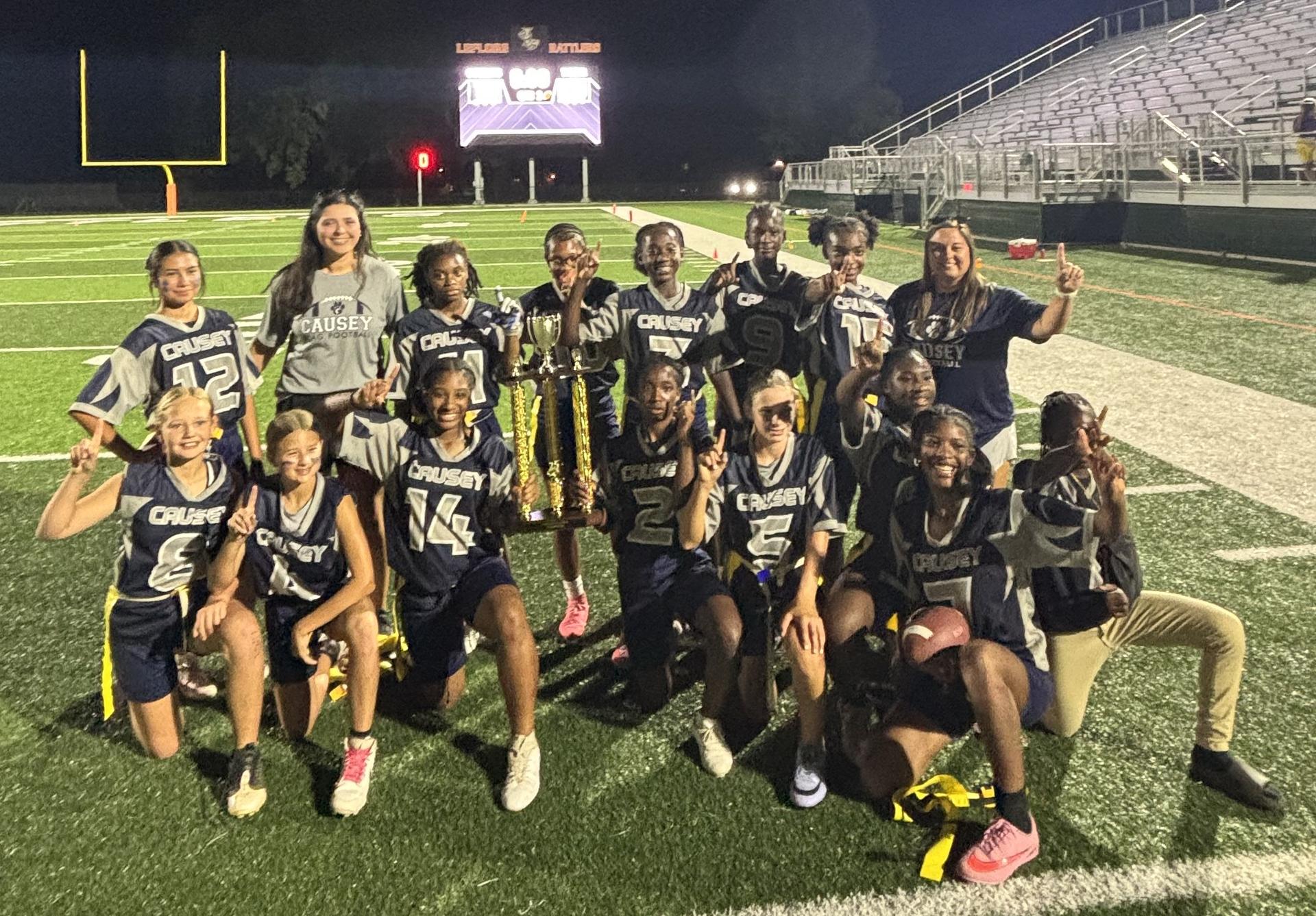 Middle school flag football champions are Causey Middle (left) in the large division and Calloway-Smith (right) in the small division. |